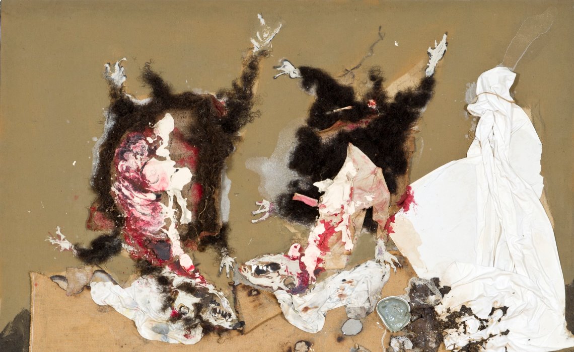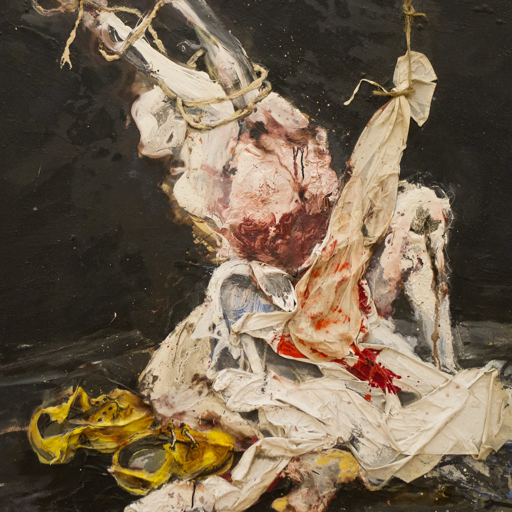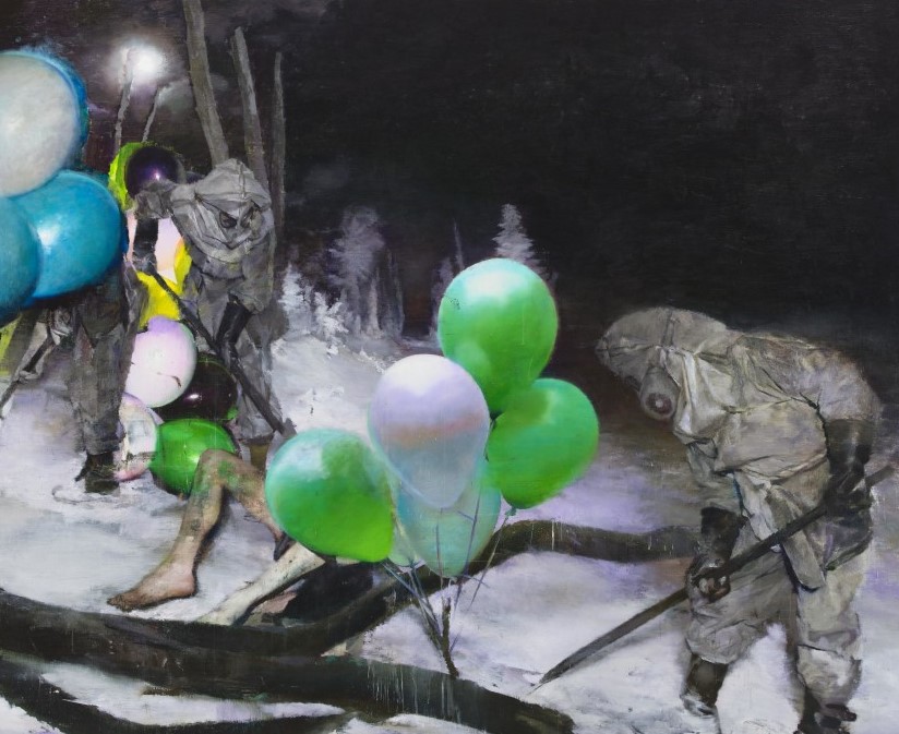 The London-based artist works from collaged photographs he’s found on the Internet or in second-hand books, and paints them in new contexts on large canvases. The bodies are often contorted—children with limbs bent by genetic anomaly, soldiers doing calisthenics, porn actors mid-performance—and the action of the final composition is ambiguous, implied, or partially hidden. In a recent series, bunches of balloons dominated the foreground of battlefields and operating rooms, and parts of prone bodies (possibly corpses) jutted out from behind them. For Mortimer, the balloons are intended to be both sardonically festive—one curator-critic has called them a nod to the post-recession hangover of the 1990s “Party decade”—and also a more heavily anxiety-laden image, meant to evoke pustules and whatever else might spontaneously burst forth from our skin.