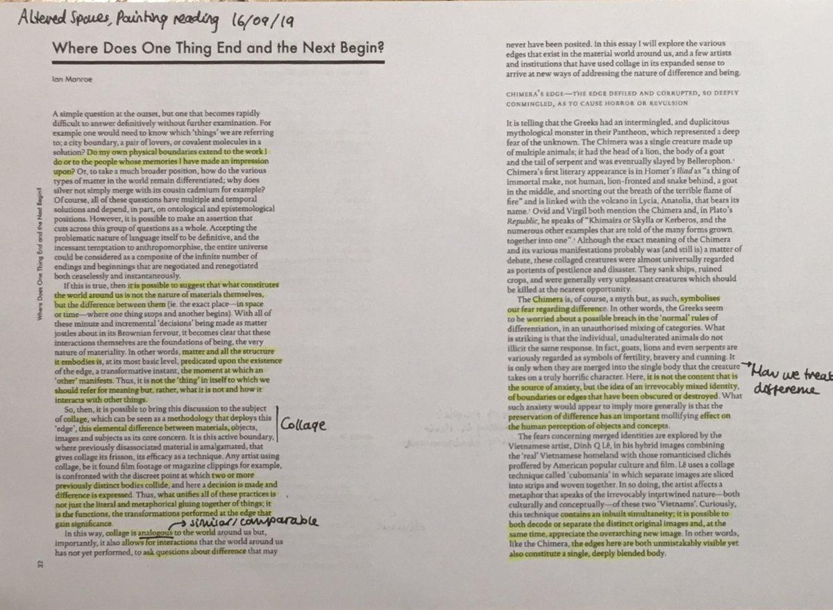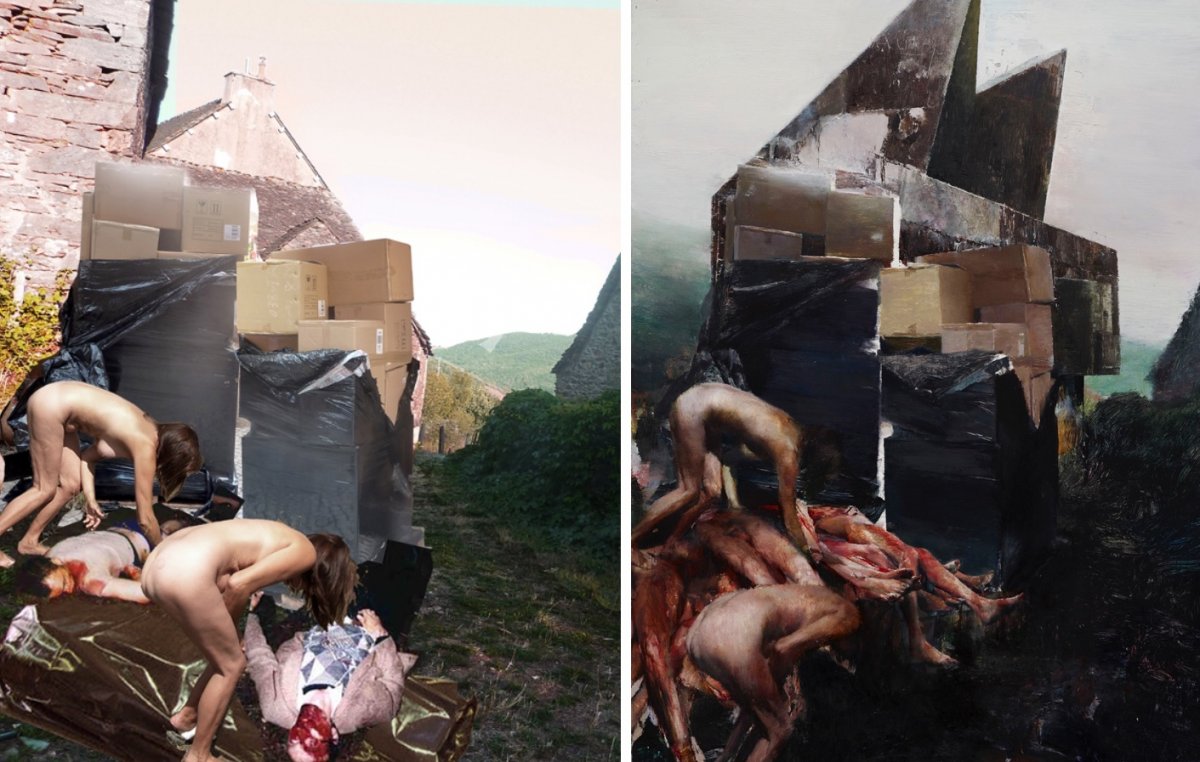 'When I’m composing ideas for pictures I roughly sketch them out on the computer. I scan images, I collect all the data that I have on my hard drive, image databases, from scans of cats, to wedding cakes, limbs, background photographs that I’ve taken on holiday. Through the process of using the computer you can come out with a very realized image very quickly making it a very seductive process. But it’s up to me to translate that to a piece of work from that digital image. I certainly become very seduced by the sort of pseudo realities that can be made in Photoshop. So when I start painting I very quickly see holes and problems in the image and also how banal that image is. It’s up to me to bring something in with the use of paint. As I make the image, the painting starts to dictate the image so I move away from the initial source that I made on the computer. In fact, I often make the image on the computer, begin the painting, see the problems or the good things, and go back to the computer to redraft that image, scale it up, and reimpose that onto the image again. So my pictures are quite fragmented looking because it’s often a combination of six different images all part of the same thing. I’m constantly looking for those serendipitous clashes with the first layer doing something interesting with the top layer. It dictates itself, it has its own volition, which is a completely different process from when you are working on the computer.'