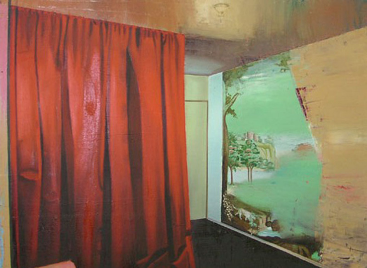 Matthias Weischer’s Interior sets up an ambience of corroded decadence. Here Weischer’s formalist interests are presented with more naturalistic qualities. Exploiting his media to its full potential, Weischer creates spatial illusion through his application as well as composition: the heavy folds of the curtain are painted with concrete ballast, while the ceiling writhes with liquid fragility. Weischer renders the receding wall with battered texture, the illusion of movement gives way to a fanciful mural; a portal to a mystical landscape, incongruous with this dilapidated setting.