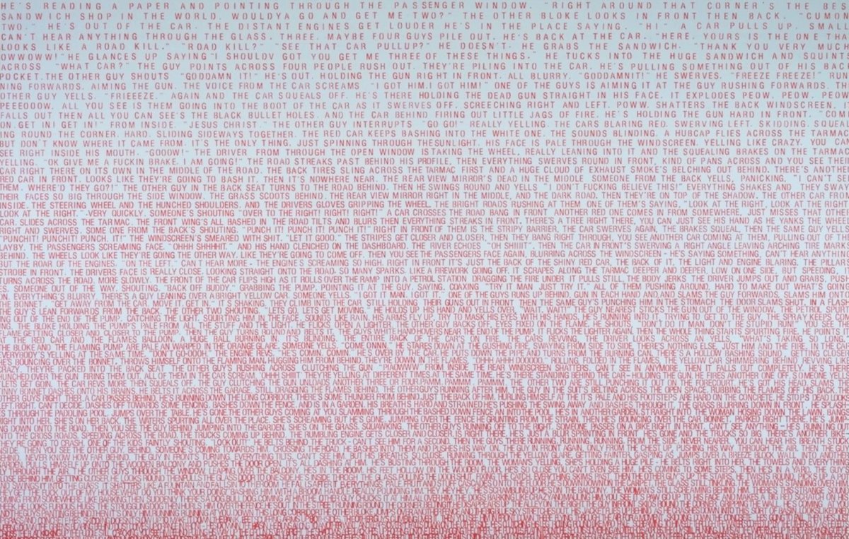 Banner came into prominence through her "wordscapes" or "still films"—works such as this one that explore how stories are perceived and reimagined, particularly in pornography, action films, epic films, and films about war. Break Point (its title reverses the title of the film) is the largest in a series of prints that considers the genre of the car chase. Here the artist transforms her detailed description of a seemingly endless, yet climactic, chase—including dialogue, action, scenery, and sound effects—into a block of text the size of a billboard or, more aptly, a cinema screen. As pursuer closes in on pursued, the words literally crash into one another, creating an abstract visual corollary to the rousing action of the film.