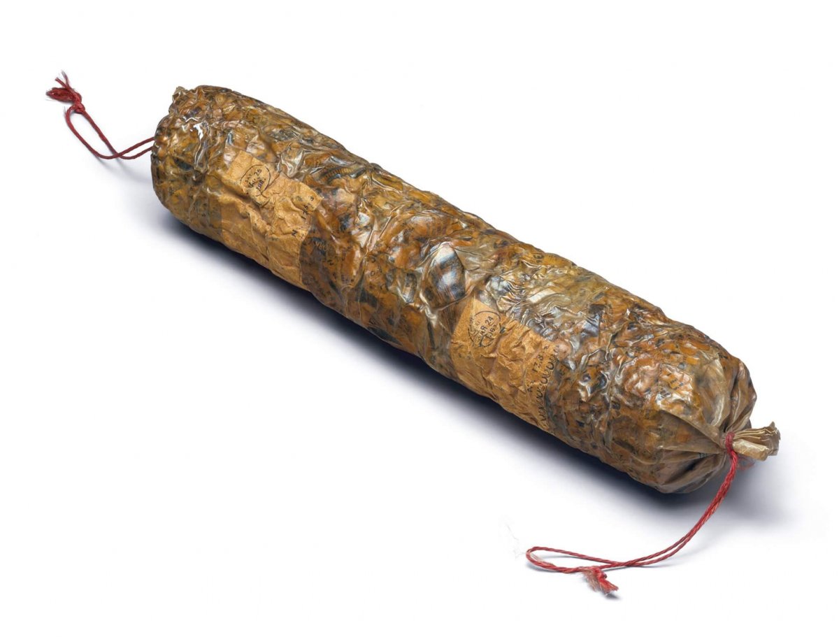 Between 1961 and 1970 Roth created about fifty 'literature sausages.' To make each sausage Roth followed a traditional recipe, but with one crucial twist: where the recipe called for ground pork, veal, or beef, he substituted a ground-up book or magazine. Roth mixed the ground-up pages with fat, gelatin, water, and spices before stuffing them into sausage casings. The source materials include work by authors and periodicals that the artist either envied or despised; they run the gamut from lowbrow illustrated tabloids to well-regarded contemporary German novels to the works of Karl Marx and the influential nineteenth-century philosopher Georg Wilhelm Friedrich Hegel. Roth turned literature into a metaphorical object for intellectual consumption and physical subsistence.