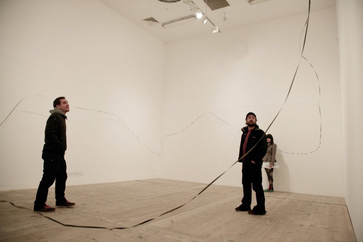 KEMPINAS: One day, I pulled tape out of a VHS cassette because I suspected that it might be a very interesting material to work with: it’s super thin, super light, and totally black, so you can perceive it as an abstract line. Since you can create many different drawings with a single line, I figured that I could use this material to make different three-dimensional installations. At the same time, tape is a data carrier. Hypothetically you can have all the colors and sounds of the world in it. So, it has this capacity, this potential, just like 35-millimeter film rolls, but it’s more abstract and simpler. And then, of course, videotape is so flexible and so light that it can be set in motion using air circulation, which becomes an invisible carrier for the sculpture.