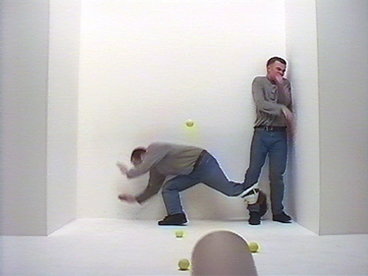 'We had been commissioned by Film and Video Umbrella to make a work for a touring film programme. We had hired a tennis ball machine from Bridgnorth tennis club in Shropshire and managed to shoot the commissioned work quite quickly and so we had a few extra days to play around with it. '3 Legged' (1997) came out of us just messing around, firing the machine at each other, standing against a wall or on chairs. As is often the way, some of the most interesting things come out of just messing around.'