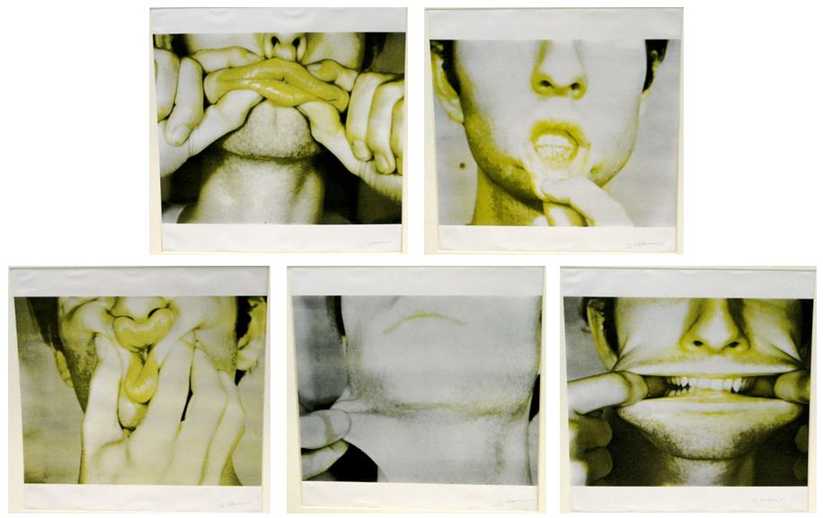 In 1968 Nauman produced a series of holograms titled Making Faces in which he contorted and stretched his face into a series of exaggerated gestures, the kind of grotesque faces pulled (playfully) by and for children in order to amuse, distract, and even terrify. The holograms were projected onto glass and have an eerie underwater quality reminiscent of a horror movie. In 1970 the artist picked up the hologram slides and selected five images from which the screen-prints were produced. In their new form - much bigger than life-size, and tinted yellow over black and white - they have been transformed into a kind of lexicon of facial expressions. They focus on the lower half of the face, in particular the mouth. Without the eyes, facial flesh is reduced to matter, and emotional connections become more ambiguous.