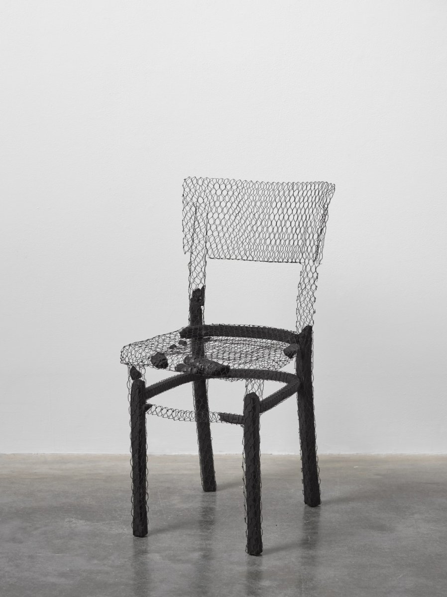 Drawing upon themes interwoven in everyday life and the larger situation of our inherently unstable world, Hatoum’s work creates a sense of profound unease through a process of visual and material seduction. By engaging the viewer in a direct phenomenological experience, industrial materials and everyday objects are transformed into potent cyphers, charged with emotive and thematic force. In the poised and disquieting installation Remains of the Day (2016−18), which evolves from work made for the 10th Hiroshima Art Prize exhibition, simple wooden furniture and domestic objects − a kitchen table, group of chairs, rolling pin, stool and vintage toy truck − are covered with chicken wire and subjected to an intense, furious heat. Burnt and charred, the resultant black and brittle charcoal forms are held together by their wire armature, appearing like ghostly shadows of the solid objects they once were, while scattered fragments across the floor imitate the possibility for further disintegration at any given moment. As if registering some sudden and dramatic catastrophe, Remains of the Day interrogates the idea of ‘home’ through familiar and symbolic forms, locating it not as a place of refuge and established order but as a site of upheaval, disorder and the uncanny.