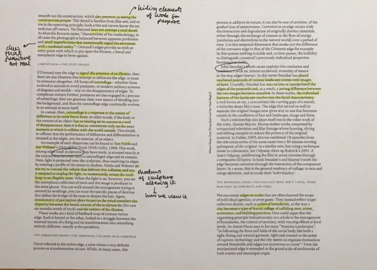 'It seems possible to imagine a complex which exists in the world as a thing in itself, generating the conditions of its own becoming, and which exists apart from the world as a model for it, exposing the conditions of its own artifice, a complex which undercuts its own logic by exposing the premise on which it was built, underpinning and undermining, drawing in and then distancing the spectator from the work in a theatre of theatre which is both true and false.'