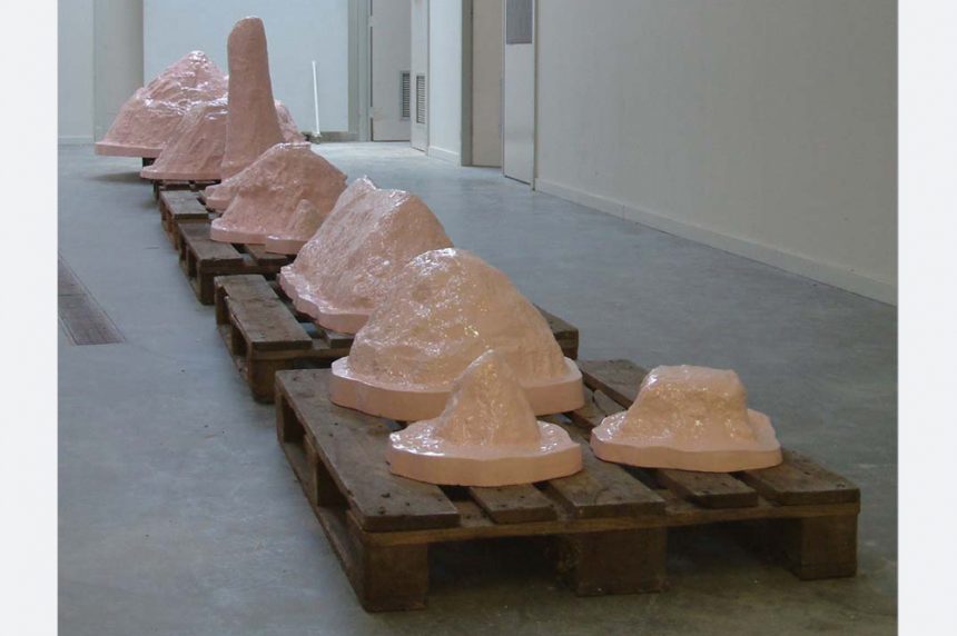 In Holes 2 the opportunity of working with clay and the inevitability of firing and glazing it got the better of their more practical inclinations. The kilns at EKWC are very large and this gave a parameter for the largest cast hole dug for a farmer in the local area. Where Holes 1 was in constant movement, Holes 2 had a heavy and inert quality that was belied by the sugary pink glaze.
